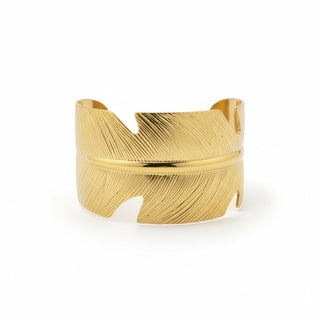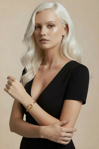 Un bracelet sculptural doré, symbole d’harmonie et de mouvement, qui sublime le poignet avec une touche d’art moderne.