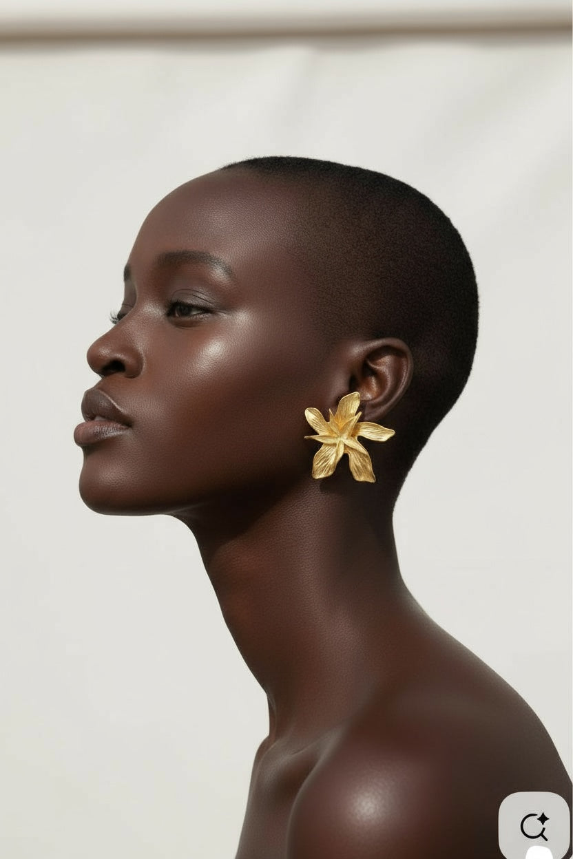 Des boucles d’oreilles florales dorées, symbole d’audace et d’élégance, qui illuminent le visage avec un éclat naturel.